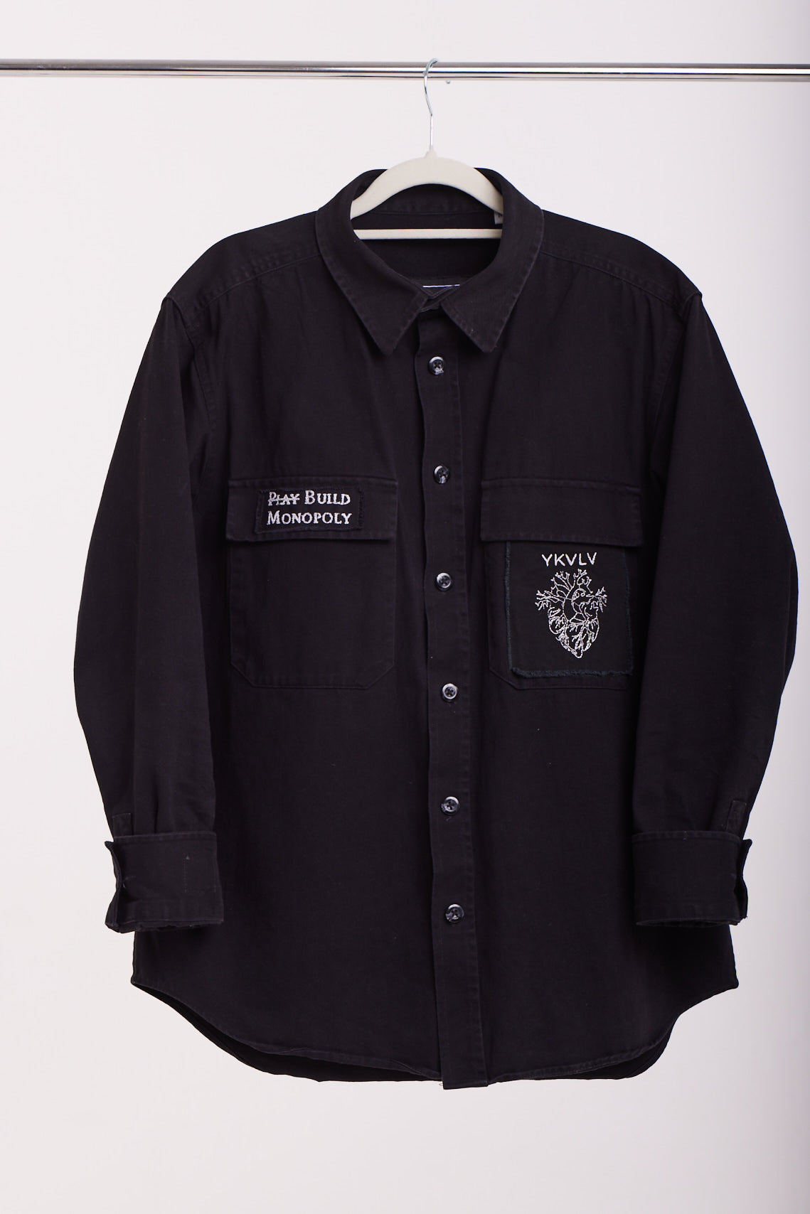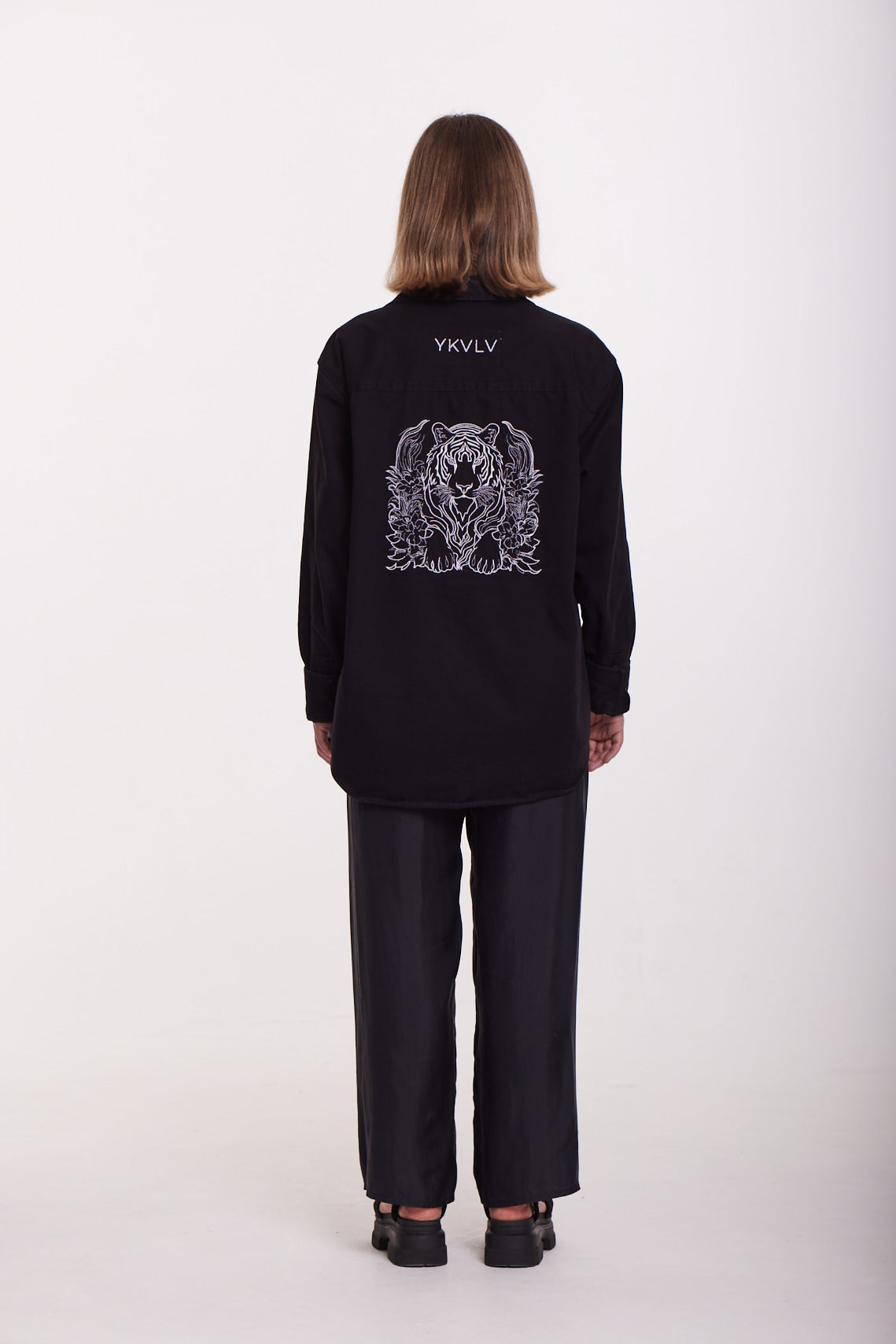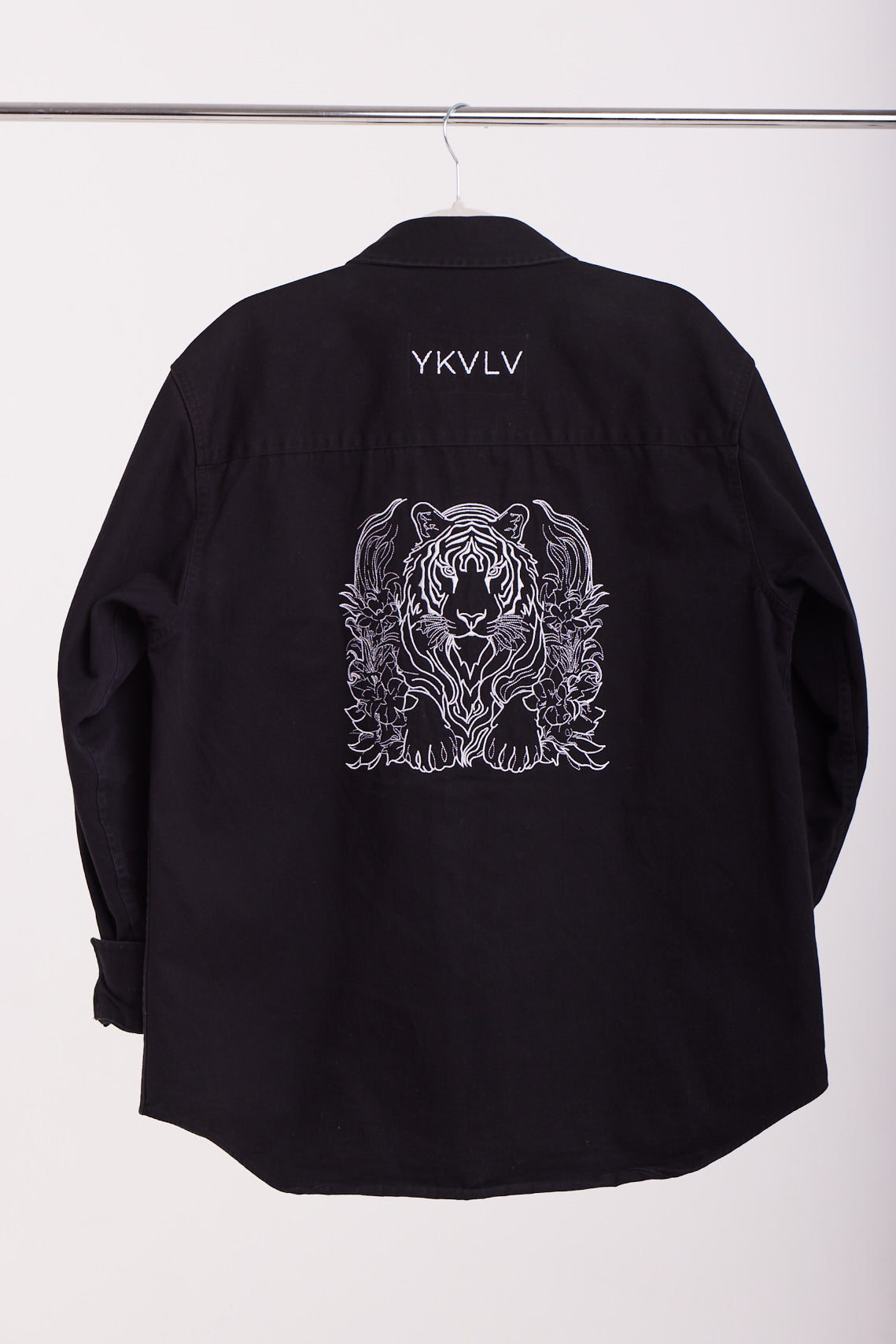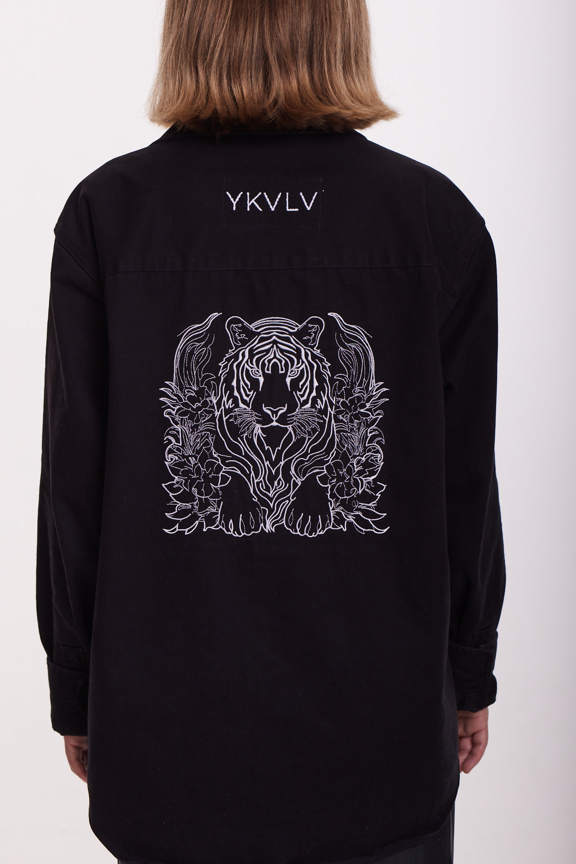 This black oversized shirt features a striking AI-generated embroidered tiger design, symbolizing power, confidence, and grace. A bold fusion of technology and fashion, it’s crafted for those who embrace fearless individuality with an artistic edge.