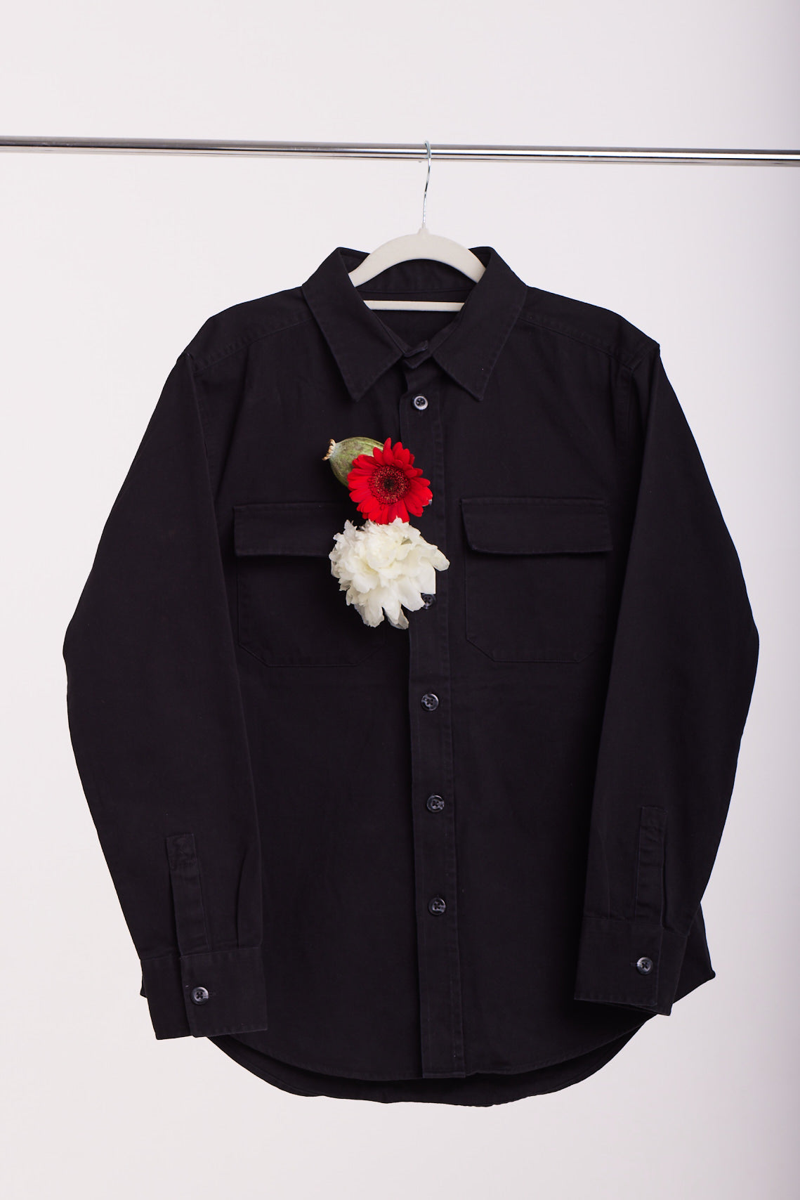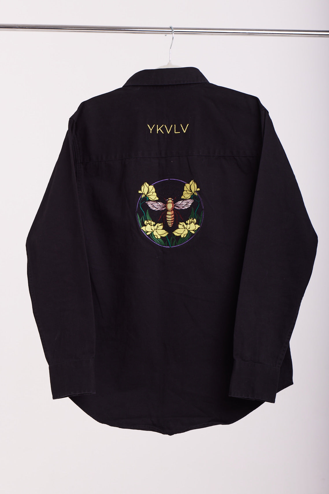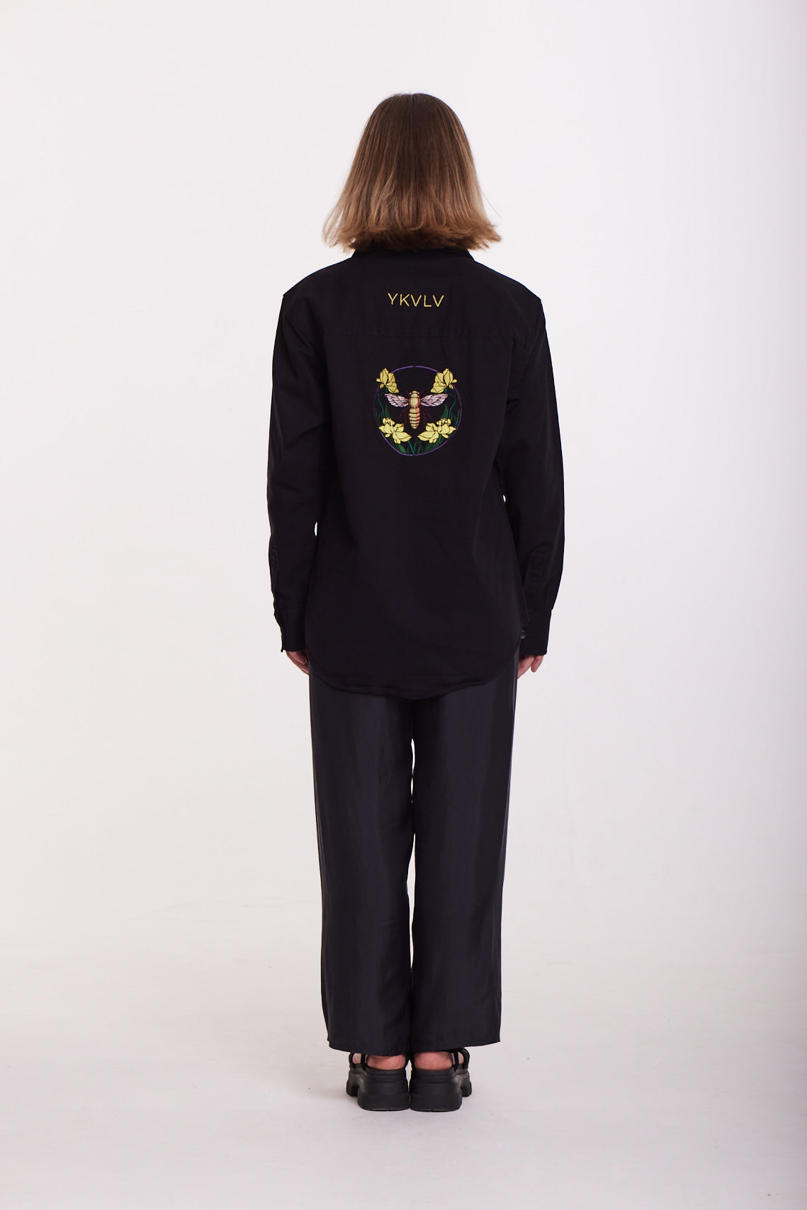 This black oversized shirt features an intricately embroidered bee surrounded by blooming yellow flowers, symbolizing resilience and harmony. A fusion of nature-inspired artistry and modern sophistication, it’s a statement piece for those who embrace strength and elegance.