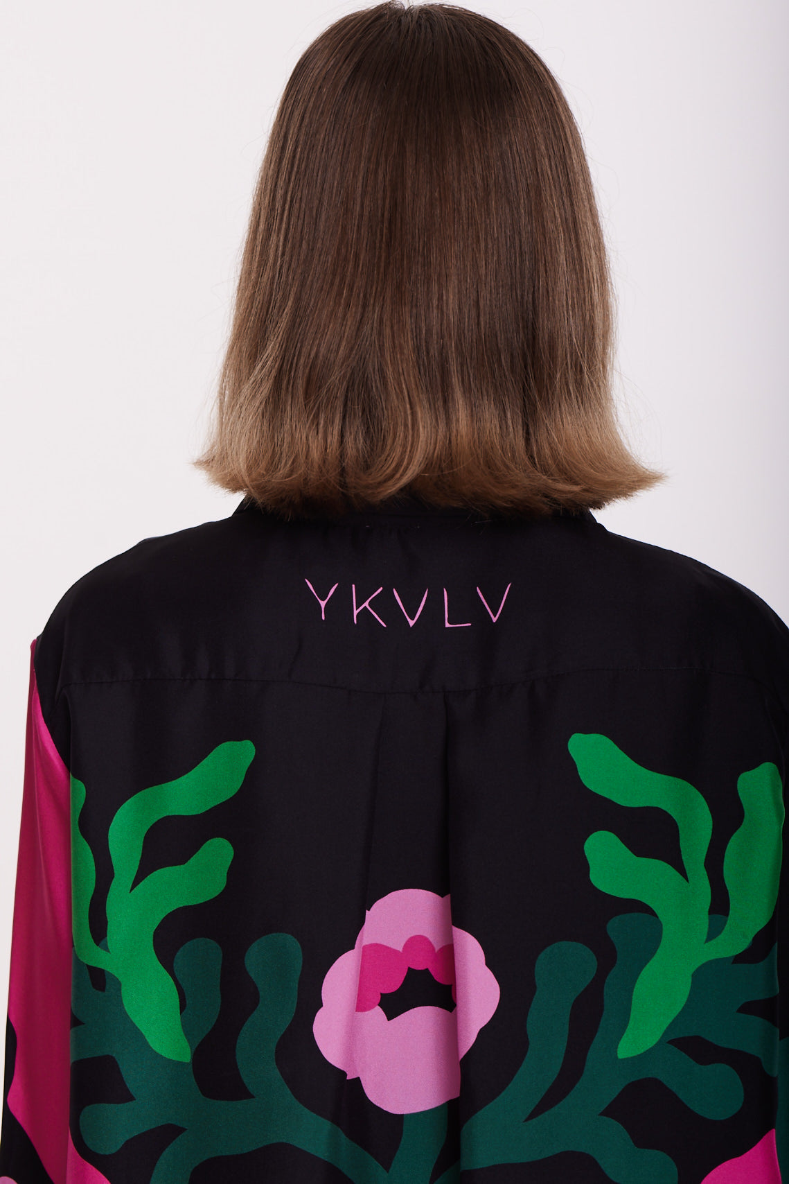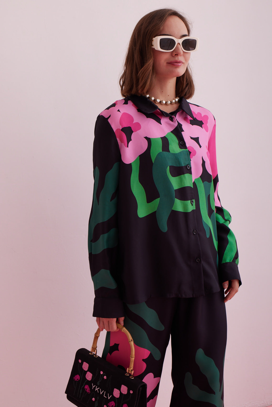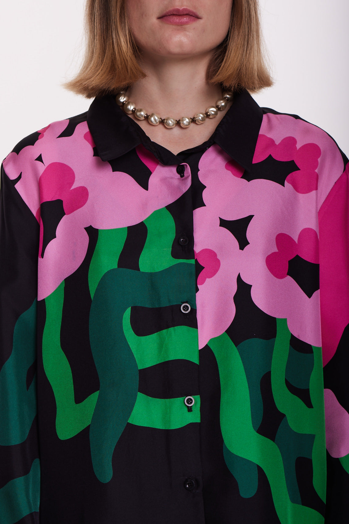 Crafted from luxurious silk twill, this full-print shirt features bold floral and organic motifs inspired by Art Nouveau. A statement piece that blends fluid artistry with modern sophistication, perfect for those who embrace timeless elegance with a contemporary edge.